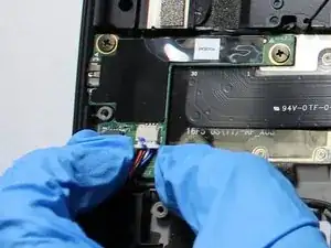 Извлеките батарею, подняв ее с верхнего края ноутбука, а затем вытяните от материнской платы.