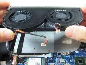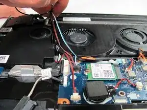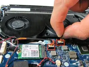 Соберите антенные кабели (чёрный и белый) и провода динамиков (красный, чёрный, синий и белый). Аккуратно отведите их от вентилятора.