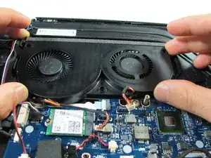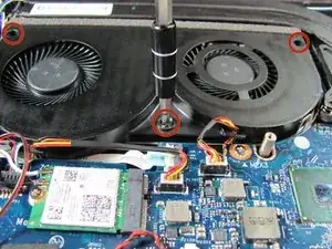 Выверните три винта длиной 3,5 мм, крепящие вентилятор, крестовой отвёрткой Philips #1.