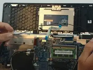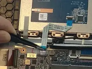 С помощью пинцета аккуратно отсоедините синюю шлейфовую ленту, соединяющую тачпад с платой.