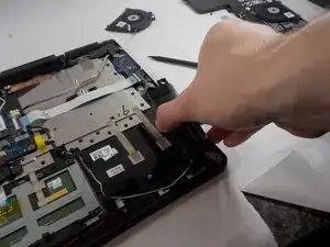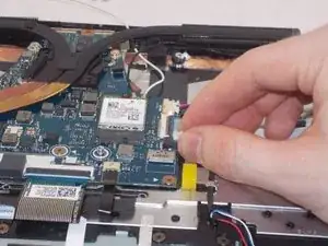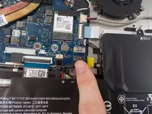 Отсоедините разъём между аккумулятором и материнской платой, аккуратно потянув за часть проводов в чёрной пластиковой оплётке.