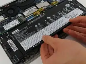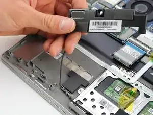 Снимите аккумулятор, приподняв у белой этикетки и оттянув по диагонали от ноутбука.