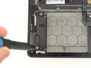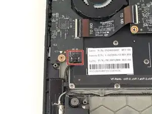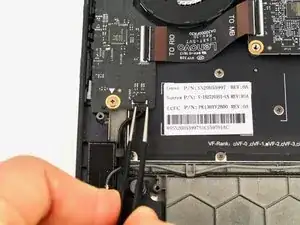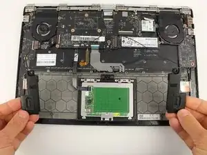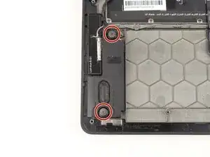 Динамики соединены вместе в единый блок, и поэтому не могут быть заменены независимо без переподключения одного из динамиков. Также стоит отметить, что кабель динамика проходит через правую дочернюю плату. Это означает, что если замена динамиков не решила ваши проблемы со звуком, возможно, потребуется замена правой дочерней платы, особенно если проблемы со звуком возникли после попадания воды на левую сторону компьютера.