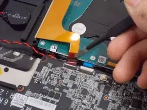 Используйте пинцет, чтобы поднять задний язычок и потянуть его назад, пока разъем ribbon cable не отсоединится.
