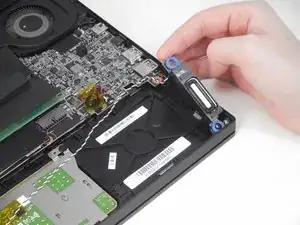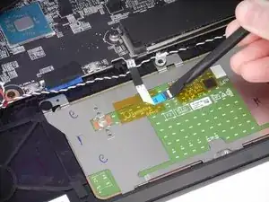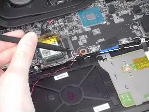 Используйте наконечник синей пластиковой монтажной лопатки, чтобы поддеть между задней крышкой и корпусом ноутбука со стороны петель.