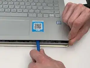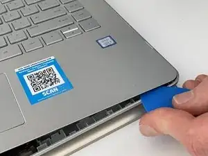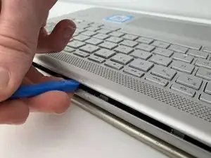 Используя тонкий конец пластиковой инструмент для вскрытия iFixit, подденьте панель клавиатуры от основания ноутбука возле шарниров экрана.