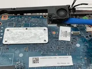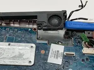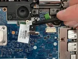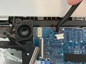 Используя изогнутый конец лопатки-алебарды, отсоедините кабель динамика от разъёма на материнской плате. Чтобы выполнить данный шаг, подденьте вилку изогнутым концом лопатки и выведите её из разъёма.