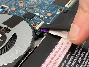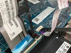 Используя пластиковую лопатку, отсоедините шлейфовые разъёмы, соединяющие материнскую плату с тачпадом и клавиатурой. Плоской стороной лопатки подденьте крышку сверху разъёма. После этого шлейф выйдет из паза.