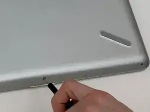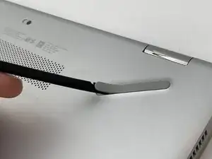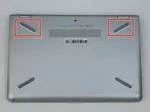 Используя плоский конец лопатки, подденьте две резиновые ножки в верхней части задней панели ноутбука.