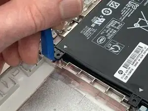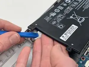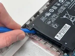Используя тонкий конец пластикового инструмента для вскрытия iFixit, подденьте аккумулятор и извлеките его из паза в основании ноутбука.
