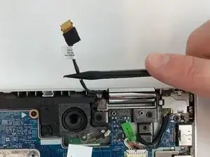 Используя тупые пинцеты, ослабьте кабели в канавке справа от динамика. Кабели закреплены двумя чёрными крючками.