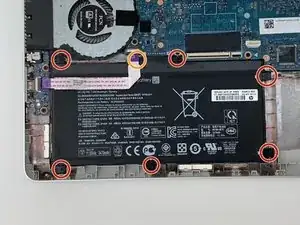 Используя крестовую отвёртку #1, удалите семь винтов длиной 4 мм вокруг аккумулятора.