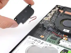Примечание: В этом руководстве динамики будут обозначаться по их реальной стороне стерео (обозначенной «L» и «R» на динамиках) относительно ноутбука, а не по их ориентации в процессе ремонта.