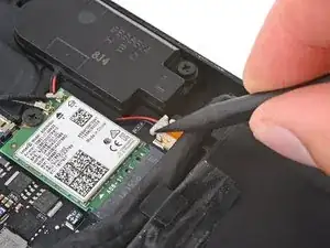 Используйте пинцет с притуплёнными концами или пальцы, чтобы отогнуть ленту кабеля аккумулятора от кабеля.