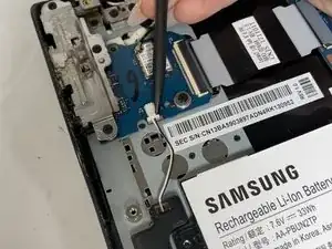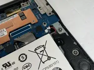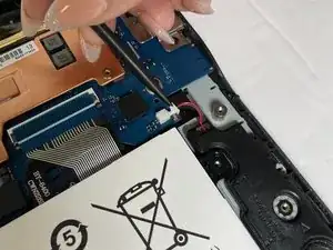 С помощью лопатки аккуратно сдвиньте разъём кабеля в сторону от материнской платы и левого динамика, чтобы отключить кабель.