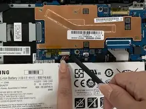 Отключите аккумулятор от материнской платы, поддев вверх разъём кабеля лопаткой.