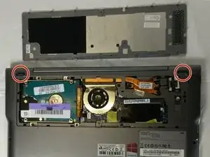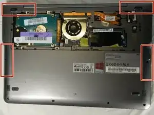 Снимите две резиновые накладки, скрывающие последние винты нижней крышки.