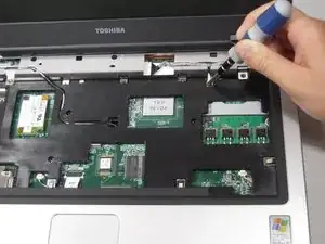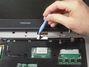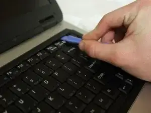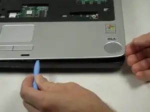Используйте пластиковый инструмент для вскрытия, чтобы приподнять верхнюю панель вдоль всей клавиатуры, пока она не ослабнет.