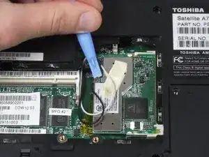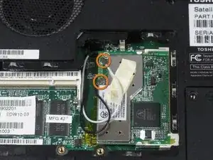 Используя пластиковый инструмент для вскрытия, отсоедините разъёмы чёрного и белого кабелей антенны от модуля Wi‑Fi.