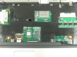 С помощью пластикового инструмента для вскрытия отсоедините два разъёма проводов динамиков и разъём трекпада от материнской платы.