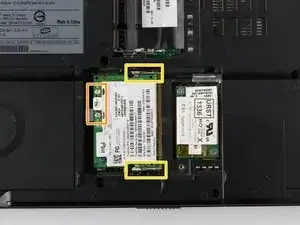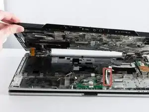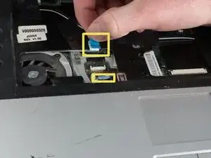Отсоедините два белых ленточных кабеля, расположенных в нижнем левом углу ноутбука.