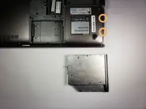 Выдвижение оптического привода откроет доступ к двум последним винтам 4 мм на нижней части устройства.
