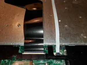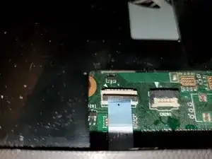 Два кабеля нужно аккуратно отсоединить перед полным снятием передней панели. Маленький разъём с проводами (возможно, для вентилятора) нужно аккуратно вывести, покачивая кончиком маленькой шлицевой отвёртки. Другой кабель (вероятно, тачпада) закреплён защёлкой с откидывающейся частью. Как показано, осторожно откиньте защёлку вверх, чтобы вынуть кабель.