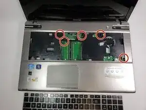 После снятия клавиатуры и винтов используйте лопатку по краям ноутбука, чтобы снять переднюю панель. Проверьте наличие дополнительных винтов, как указано в шаге 3.