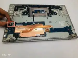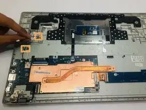 После снятия винтов снимите серую деталь с маркировкой «bracket battery BA61 - 03983A.» Эта деталь расположена над золотой лентой, соединяющей аккумулятор и материнскую плату.