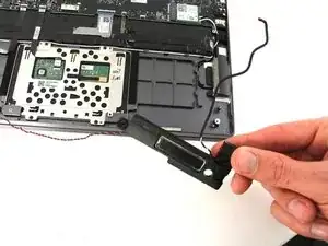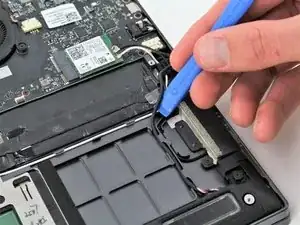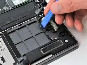 С помощью лопатки поднимите чёрный провод, соединяющий динамики с материнской платой, из его направляющего паза.