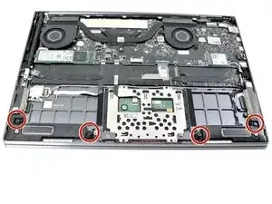 Выкрутите четыре винта длиной 2 мм, крепящих динамики к корпусу ноутбука, с помощью крестовой отвёртки №00.