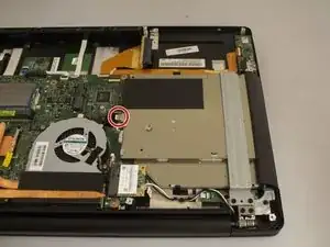Используйте отвертку Phillips #0, чтобы выкрутить один серебристый винт 5 мм, соединяющий дисковод с материнской платой.