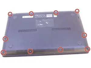 Используйте отвертку с насадкой Torx T4, чтобы выкрутить десять винтов с головкой Torx 4 мм на нижней панели ноутбука.