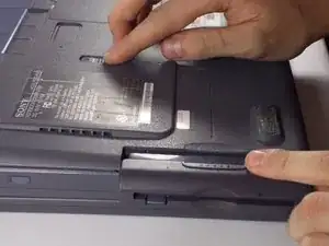 Сдвиньте кнопку в направлении стрелки и вытяните дисковод.