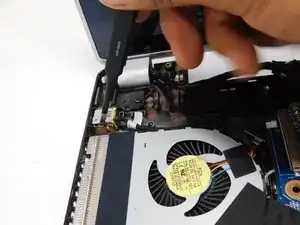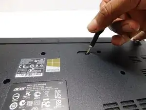 Используйте заострённый инструмент (мы использовали отвёртку), чтобы сдвинуть фиксатор вправо, глядя на ноутбук со стороны без батареи.
