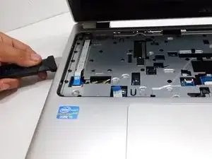 Вставьте инструмент (Jimmy) между клавиатурой и верхней панелью. Аккуратно подденьте защёлки, чтобы клавиатура освободилась. НЕ ВЫТЯГИВАЙТЕ КЛАВИАТУРУ ПОКА.
