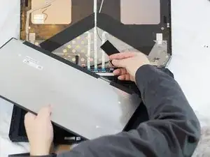 С помощью пластикового инструмента для вскрытия отделите кожух дисплея от корпуса.