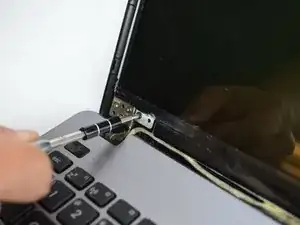 После удаления двух винтов используйте пластиковый открыватель, чтобы снять чёрную крышку вокруг экрана.