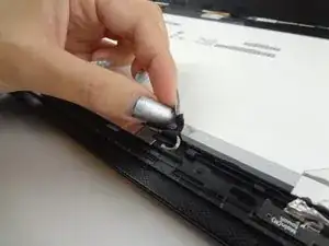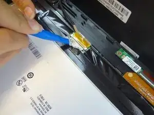 Используйте инструмент для вскрытия, чтобы отлепить клейкую этикетку, фиксирующую кабель ЖК к дисплею.