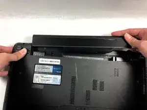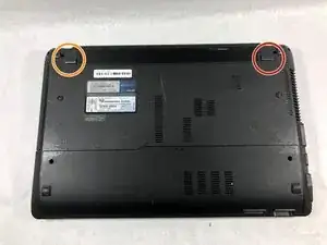 Переверните ноутбук так, чтобы нижняя сторона была обращена вверх, и найдите два переключателя с каждой стороны батареи.