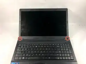 Откройте ноутбук и найдите два круглых наклейки в нижних углах дисплея.