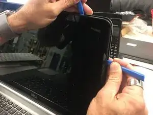 Используя две пластиковые монтажные лопатки или лопаточку, аккуратно пройдитесь по периметру рамки ЖК-экрана, пока она не освободится от корпуса дисплея. При необходимости применяйте тепло, но осторожно — перегрев может деформировать рамку.