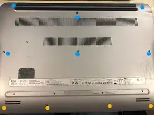 Отвинтите шесть винтов 2.5x6 мм (синие) и удалите их с помощью крестовой отвертки Phillips #1. Центральный винт намагничен и выпадет, когда ноутбук перевернуть. В противном случае его может быть трудно извлечь.