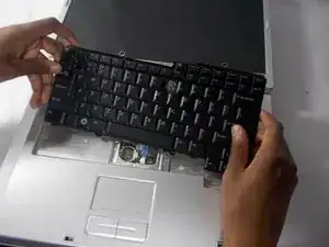Поднимите верхнюю часть клавиатуры и оттяните клавиатуру от корпуса ноутбука.