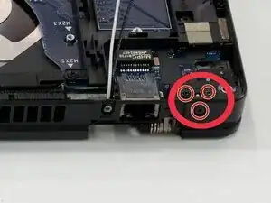 Удалите два винта длиной 3.00 мм, винты Phillips #00, крепящих крышку порта дисплейного кабеля.