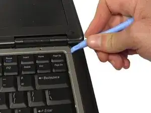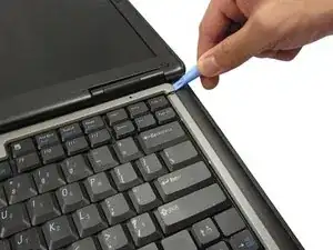 Используя пластиковый инструмент для вскрытия, подденьте угол рамки клавиатуры, отщёлкивая фиксаторы.
