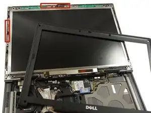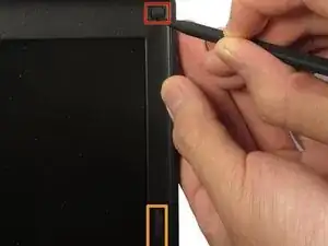 С помощью лопатки медленно отожмите рамку дисплея от корпуса ноутбука. Для этого поместите лопатка в небольшой зазор между смежными частями экрана вдоль кромки и осторожно продвигайте её по шву, пока рамка не освободится.