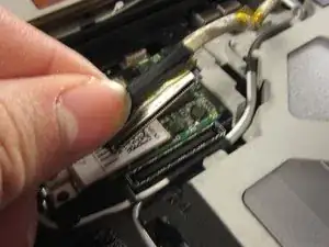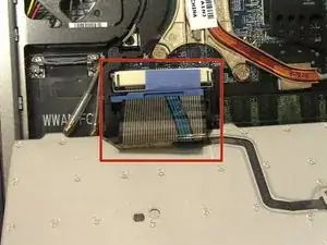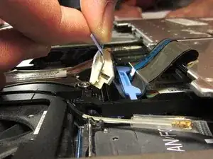 Найдите и отсоедините ленточный кабель дисплея, аккуратно потянув за синюю накладку, показанную на фотографии.