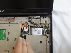 Вставьте заострённую сторону лопаточки под золотистый разъём чёрного кабеля на модуле WWAN и поднимите, чтобы отсоединить.