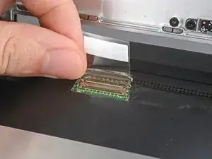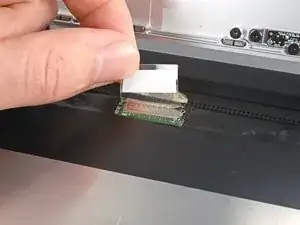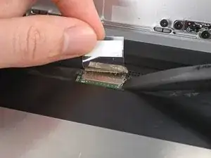 Используйте плоский край лопатки, чтобы приподнять металлическую фиксирующую лапку над разъёмом дисплея.